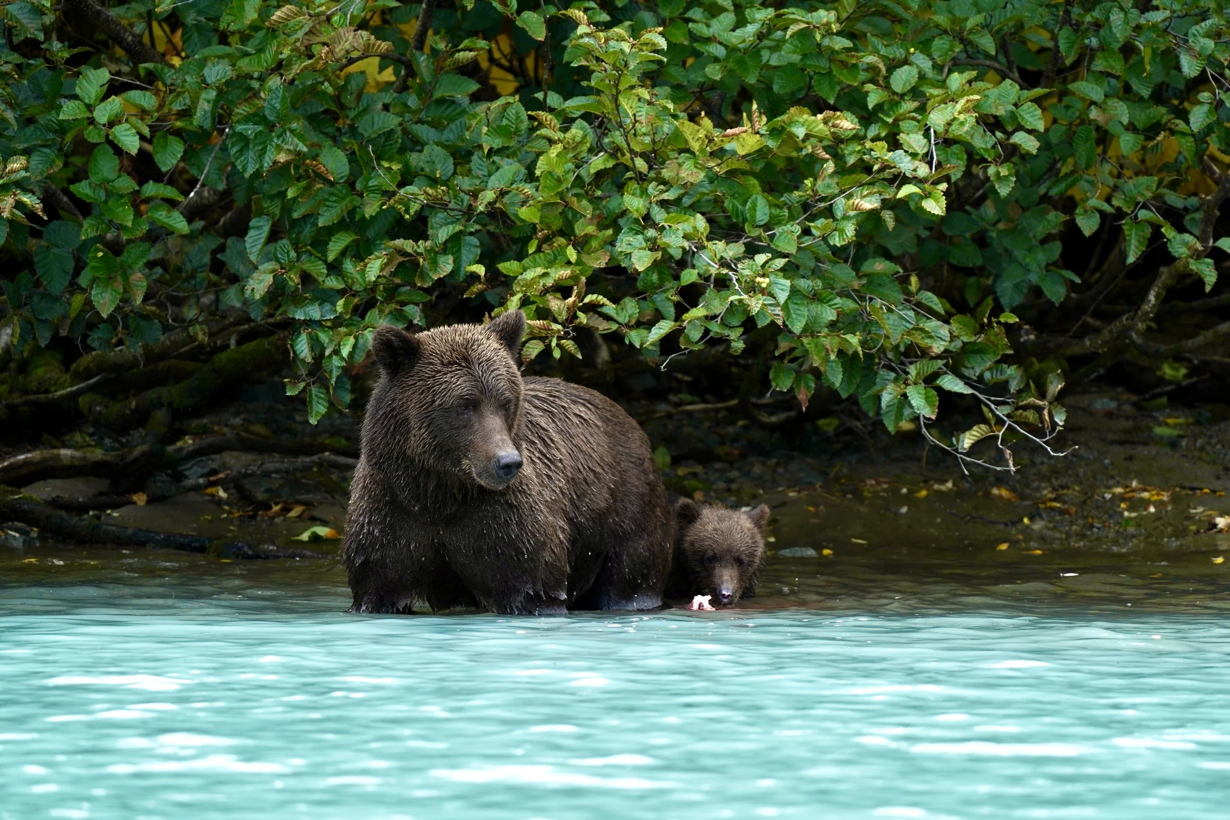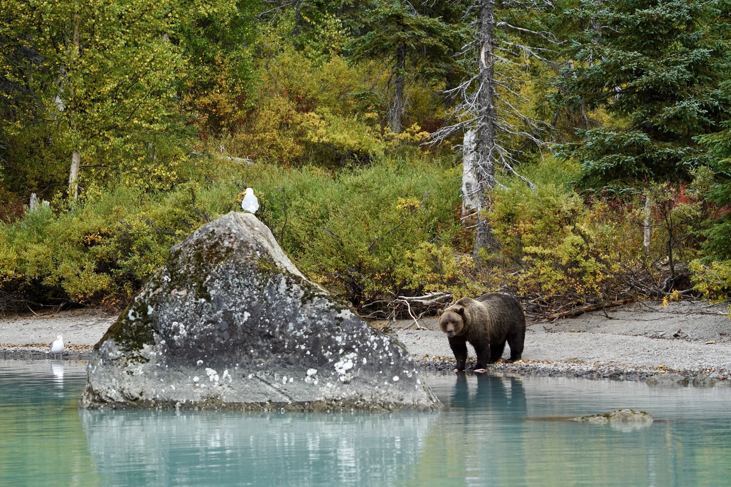 The best time to view bears in this location is in August and September. Photographers love this place, especially in mid- and late-September, when the local foliage transforms into beautiful autumn colors, creating a stunning backdrop for bears and the turquoise lake waters.