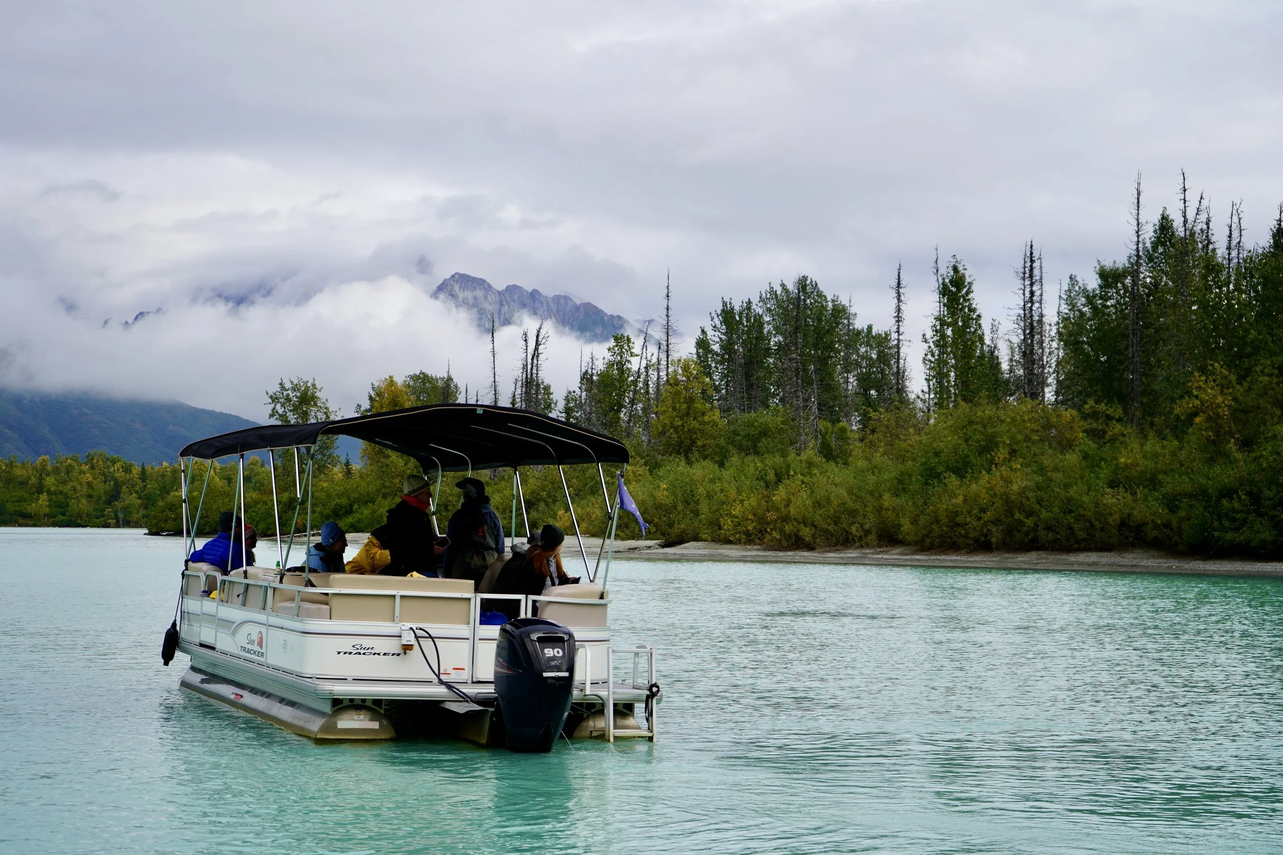 About 60 minutes after taking off from Anchorage, the plane began its descent, and suddenly, we caught our first breathtaking glimpse of Crescent Lake and the Redoubt Mountain Lodge, where guides and boats were already eagerly waiting for our arrival. Once we disembarked from the plane, all participants were asked to complete waivers and use the restroom. After that, we were smoothly escorted onto the pontoon boats, where we were provided with raincoats for potential rain and wind protection. I’d like to mention that we had already been bear viewing in various places, but the boats at Redoubt Mountain Lodge were definitely the most modern, clean, and comfortable.