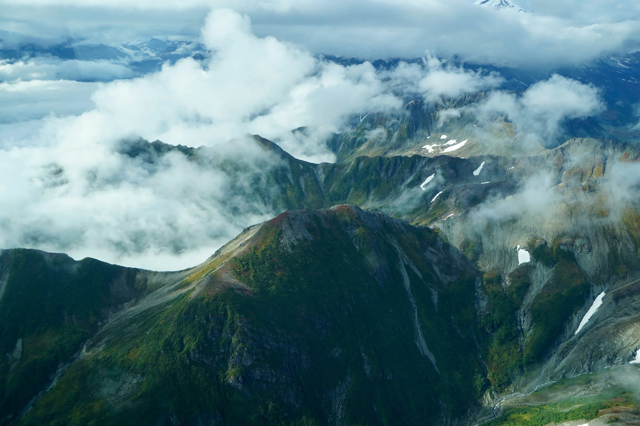 On that particular day, three float planes flew over Crescent Lake. After a short briefing with the pilot, we were assigned seats, and the adventure began. These are small planes, so there is very limited legroom, but every passenger has a window view. Your backpack will be stored in the back of the plane, so make sure that you have everything you need during the flight in your pockets. Due to the cloudy conditions, the flight on that specific day was not the most spectacular for the most part. However, we still had the opportunity to observe impressive rivers, the waters of Cook Inlet, and marshes along the route. After about 45 minutes of flight, the pilot rose above the clouds, and we could see the high peaks of Lake Clark National Park, including Redoubt Volcano.